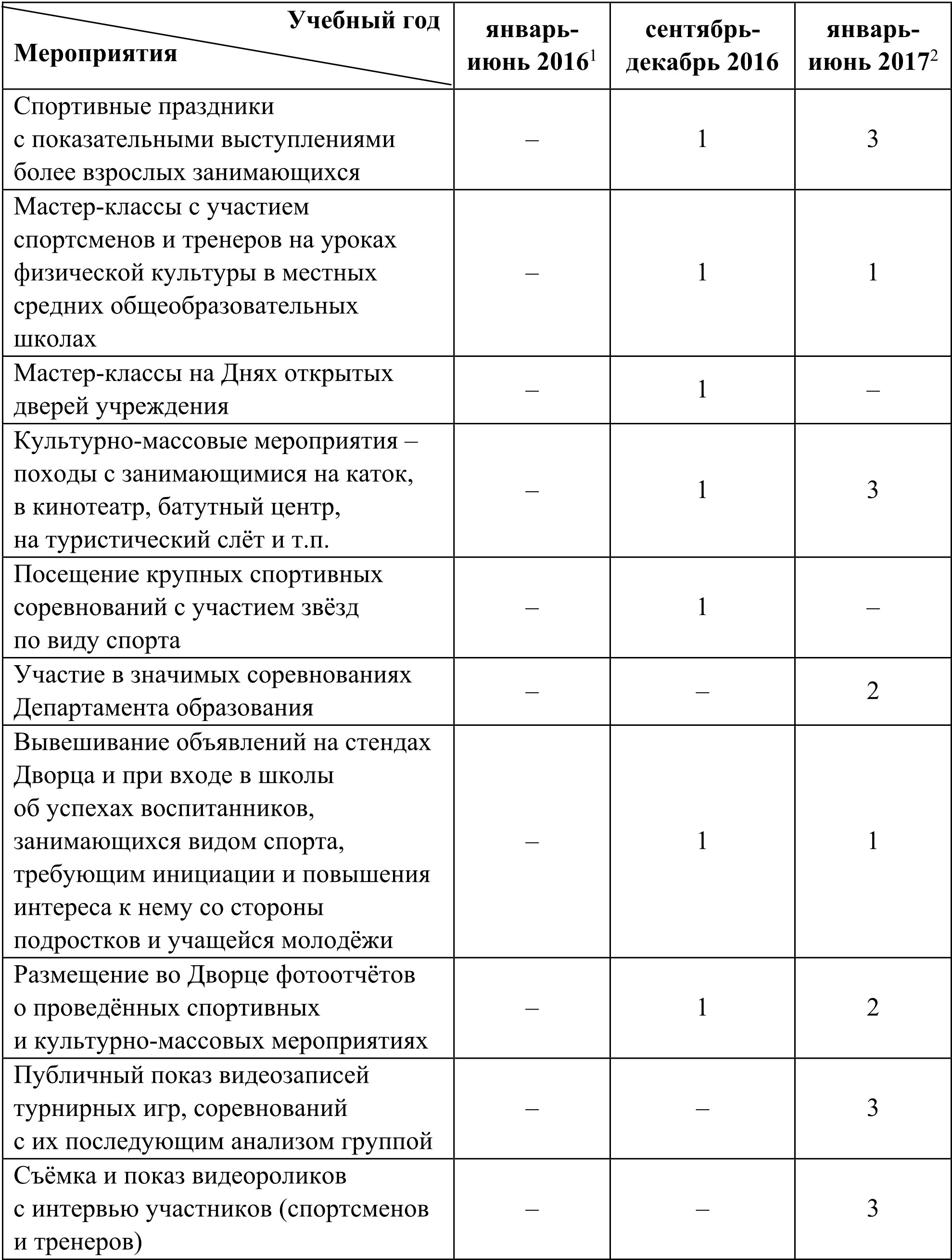 В табл. 3.4 приведён перечень видов мероприятий по формированию интереса к виду спорта гандбол, организованных в ГБОУДО ДТДМ «Неоткрытые острова» (графа 1), и динамика их количества в период эксперимента (графы 2–4).