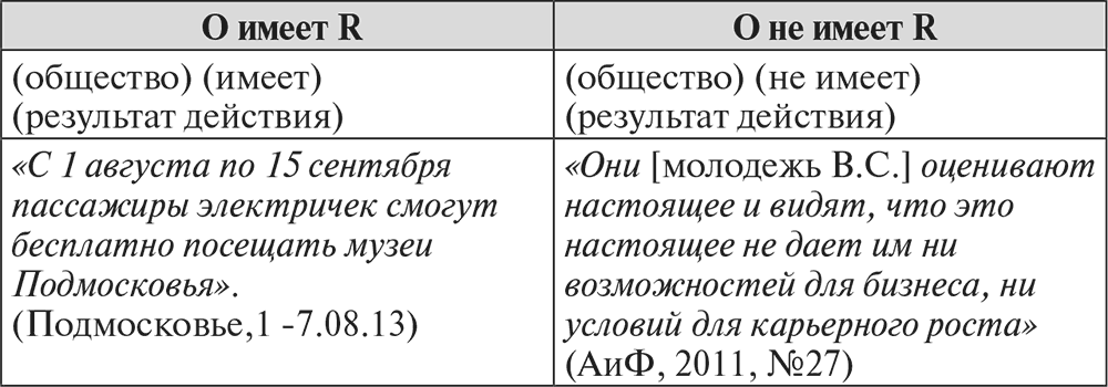Такие же две модели существуют в описании адресата действий власти, т. е. общества, и в описании результата этих действий. Обозначим главные смысловые компоненты этих моделей: О – общество, R – результат действий. При этом конкретное лексико-синтаксическое воплощение может меняться, но семантический инвариант остается одним и тем же и выглядит следующим образом: