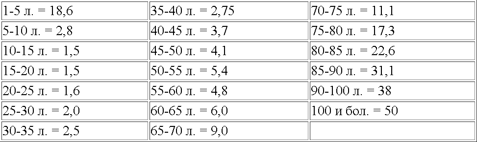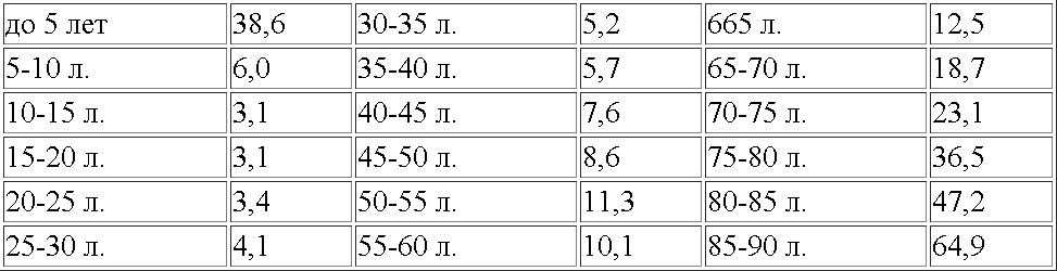 Выше были приведены вычисления Чедуика, по которым естественная смертность английских детей в первом пятилетии равняется 20 %, но их действительная смертность повсюду превосходит этот minimum. Для России, напр., она равна 39,7 %, для Англии – 25,8 %, для Франции – 29,3 % и т. д. Эти излишки должны быть отнесены насчет гибели от борьбы за существование; на основании этих излишков мы можем вычислить влияние борьбы за существование на смертность в первые пять лет. Если мы предположим, что и дальше борьба за существование оказывает такое же влияние на смертность, т. е. увеличивает смертность в том же размере, то мы получим возможность определить естественную смертность для всего населения. Разделяя 39,7 на 20, мы получаем цифру 1,985, выражающую степень влияния на русскую смертность борьбы за существование; общая смертность в России = 3,6 %, так что, уменьшая это число в 1,985, мы получим, по нашей гипотезе, естественную смертность для России, равную 1,8135 %. Сделав такое же вычисление для Франции (смертность детей – 29,3 %, общая смертность = 2,4 %), получим естественную смертность – 1,6382 %, для Англии (смертность до 5 лет = 25,8 %, общая = 2,3 %) = 1,783 %; для Бельгии (смертность до 5 лет = 27 %, после 5 лет = 2,3 %) = 1,7037 %. Все цифры весьма близки между собою; несколько противоречащею является только цифра для Швеции, оказавшаяся всего – 1,1898 %; эта аномалия понятна, если обратить внимание на % смертности; для детей он в Швеции = 35,3 %, т. е. несколько ниже только смертности детей в России, превышая в то же время % остальных стран Европы, между тем общая смертность ниже смертности всех цитированных народов = 2,1 %. Чем объяснить такое странное явление, странное потому, что вообще статистика показывает, что %% смертности различных возрастов в различных государствах более или менее прямо пропорциональны. Вычисляя среднюю цифру естественной смертности на основании данных для этих 5 государств, мы получим – 1,6256 %; а без Швеции, которая, очевидно, находится в каких-то анормально неблагоприятных условиях для первого возраста и в самых благоприятных для последующих, эта средняя цифра естественной смертности повысится до 1,7346 %. Принимая, таким образом, гипотезу, что борьба за существование действует с одинаковою силою на все возрасты и число жертв, ею ежегодно уносимых, во всех возрастах составляет одинаковый % общего числа смертей, мы получим приблизительный % естественной смертности в 1,7346. Во всяком случае, он не будет ниже этой цифры, так как скорее можно предположить, что борьба за существование гибельнее действует на первый возраст, чем на последующие. Отсюда мы должны определить среднюю жизнь, имея перед собою только % смертности; раз предположив, что естественная наименьшая смертность распределяется по возрастам соответственно распределению по возрастам действительной смертности, так как борьба за существование равно сражает все возрасты, раз предположив это, мы можем приблизительно подойти к средней жизни, искомой нами. Для России мы имеем для женского пола следующий % смертности по возрастам:
