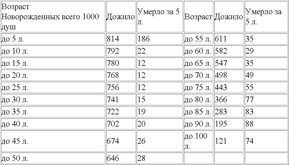 Таким образом, за 100 лет переживет около 1/9 всего поколения, но при 50 % смертности (собственно говоря, 48,1 %) в первое пятилетие умрет 60 чел. и останется – 61, во второе пятилетие умрет 30, в третье – 15, в четвертое – 8, в пятое – 4, в шестое – 2, а оставшиеся 2 умрут один в седьмое, один в восьмое пятилетие (между 135 и 140 годами). Если мы теперь сделаем предположение, что в продолжение каждого пятилетия умирает ежегодно средним числом одинаковое количество человек, то получим всего годов жизни для всех 1000 человек = 58404, т. е. средняя жизнь будет равняться 58,4.