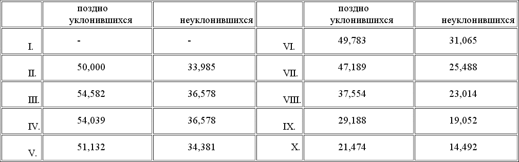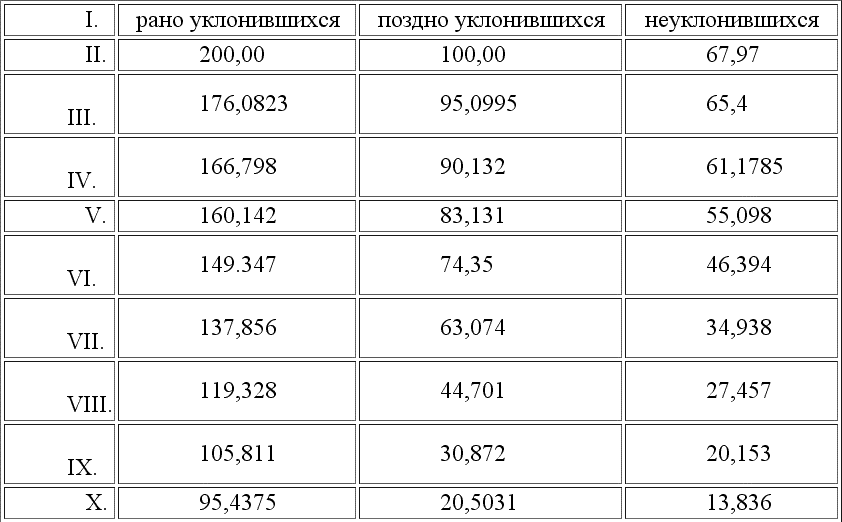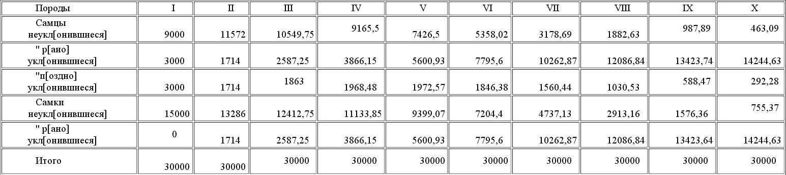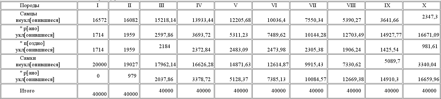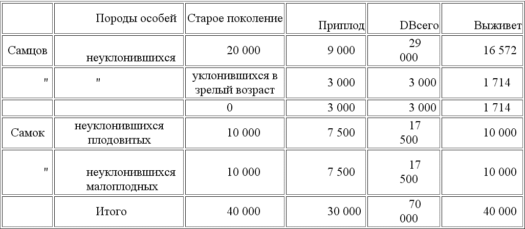 Выводы ясны; таблицы красноречивы сами по себе и многих комментариев не требуют. Очевидно, что рано или поздно процесс полового подбора должен вытеснить не только неуклонившиеся формы, не привлекательные для самок, но и поздно уклонившиеся, равно привлекательные, как и ранние уклонения. Такой результат происходит от двух причин: 1) от абсолютной неравночисленности размножающих уклонение особей, происходящей вследствие нашего молчаливого допущения, что только потомки мужеского пола поздно уклонившихся особей передают этот признак своим детям. Насколько мы имели право сделать подобное предположение и в каких пределах оно согласно с действительностью, мы разберем немного позже. 2) Вторая причина большей быстроты размножения рано уклонившихся особей заключается в том, тоже молчаливо допущенном условии, что в то время как потомки рано уклонившихся особей все наследуют родительский признак, между потомками поздно уклонившихся часть, происшедшая от спариванья с рано уклонившимися самками, увеличивают собою ряды не отцовской, а материнской породы. Основания для этих допущений мы сейчас рассмотрим, но если они правильны, то становятся вполне понятны результаты наших вычислений, что станет еще нагляднее из нижеследующих таблиц плодовитости и приращения разных пород. Общее число рождений в нашем гипотетическом виде 30.000 особей при численности всего вида в 40.000, так что на 100 особей всех пород рождается приплода 75 детенышей всех пород. Таков % рождаемости нашего вида вообще, а вот таблица рождаемости каждой породы, вычисленная для каждого поколения.