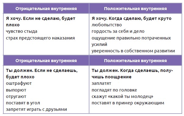 Рассмотрим другой пример. Возьмем две семьи, в которых растут мальчики примерно одного возраста. Один из них читает взахлеб, другой – игнорирует книги как явление. Родители второго подростка прикладывают массу усилий: покупают ему дорогие книжки с хорошими иллюстрациями, выделяют для чтения специальное время, уговаривают, заставляют, ругают, но все это не работает. Мальчик не дает себе труда ознакомиться даже с произведениями школьной программы и, как следствие, имеет множество проблем. Очевидно, что у первого ребенка есть устойчивая внутренняя позитивная мотивация к чтению. Со вторым все гораздо интереснее. Внутренней мотивации к чтению у него нет, зато, усилиями родителей, есть внешняя. Позитивная она или негативная? Скорее всего, смешанная, поскольку уговоры и обещания чередуются с порицанием. Может ли такая мотивация быть устойчивой? Крайне редко и в течение очень небольшого промежутка времени.