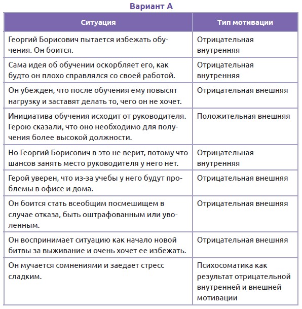А. Инициатива исходит от руководителя. Нашему герою сказали, что учеба необходима для получения более высокой должности. Он в это не верит, потому что руководитель еще жив, признаков ухудшения самочувствия не демонстрирует и нет никаких шансов в ближайшем будущем занять его место. Сама идея обучения оскорбляет Георгия Борисовича: можно подумать, он плохо справляется с работой. Наш герой ждет, что после возвращения в офис ему увеличат нагрузку. Уверен, что на работе начнется завал, а дома – недосып и напряг. С другой стороны, он боится в случае отказа стать всеобщим посмешищем, быть оштрафованным или даже уволенным. Очередная битва за выживание уже маячит на горизонте. Георгий Борисович не может найти повода, чтобы избежать переподготовки. От размышлений у него начинает болеть голова. Стресс он заедает сладким.