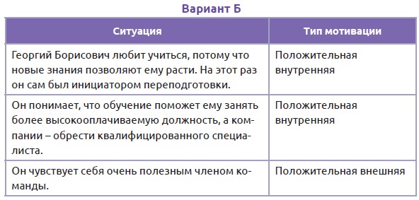Б. Георгий Борисович сам был инициатором обучения. Ему нравится узнавать что-то новое, поскольку каждый освоенный навык уводит его от рутинной работы. Переподготовка позволит ему занять хорошую должность с высокой зарплатой, а компании – получить квалифицированного специалиста. Георгий Борисович чувствует себя полезным. Он привык доводить любое дело до конца и теперь готов сконцентрироваться на учебе, чтобы получить максимальный результат. Наш герой уверен, что у него все получится, и рассчитывает на поддержку коллег и руководства. Трудности Георгия Борисовича не пугают. Он смотрит в будущее с оптимизмом и заражает им окружающих.
