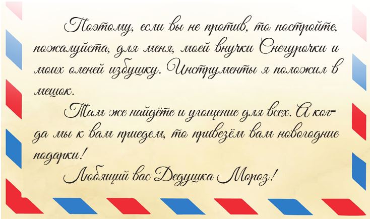 А уже вечером, когда было темно, по небу пролетали олени, запряжённые в сани. И оттуда прямо на их главную поляну леса упал огромный красный мешок. Вот тут уже сбежались посмотреть и взрослые звери! К мешку подошёл самый главный и храбрый Медведь-Богатырь. Он понюхал мешок, улыбнулся и развязал его. И…. вытащил из мешка письмо и мешочек со сладкими сухофруктами! Всем зверюшкам досталось вкусное лакомство по кусочку.