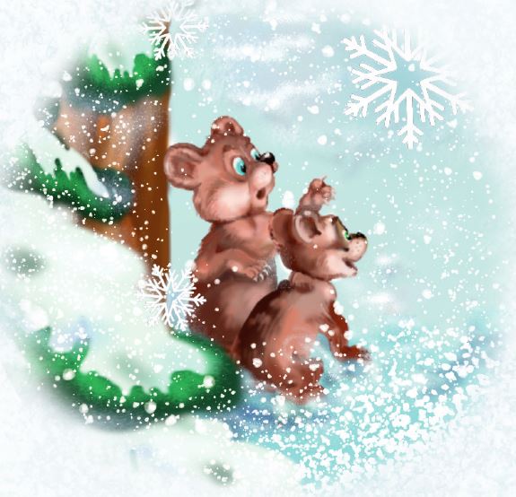 Все зверята не могли налюбоваться и наиграться: барахтались в снежке, кувыркались, скакали – чего только не творили! Мама Медведица ворчала на медвежат, что пора идти в берлогу и укладываться спать на всю зиму. Но Славик и Любчик ни в какую не хотели: ведь пока они будут спать, в лесу может произойти столько всего интересного!