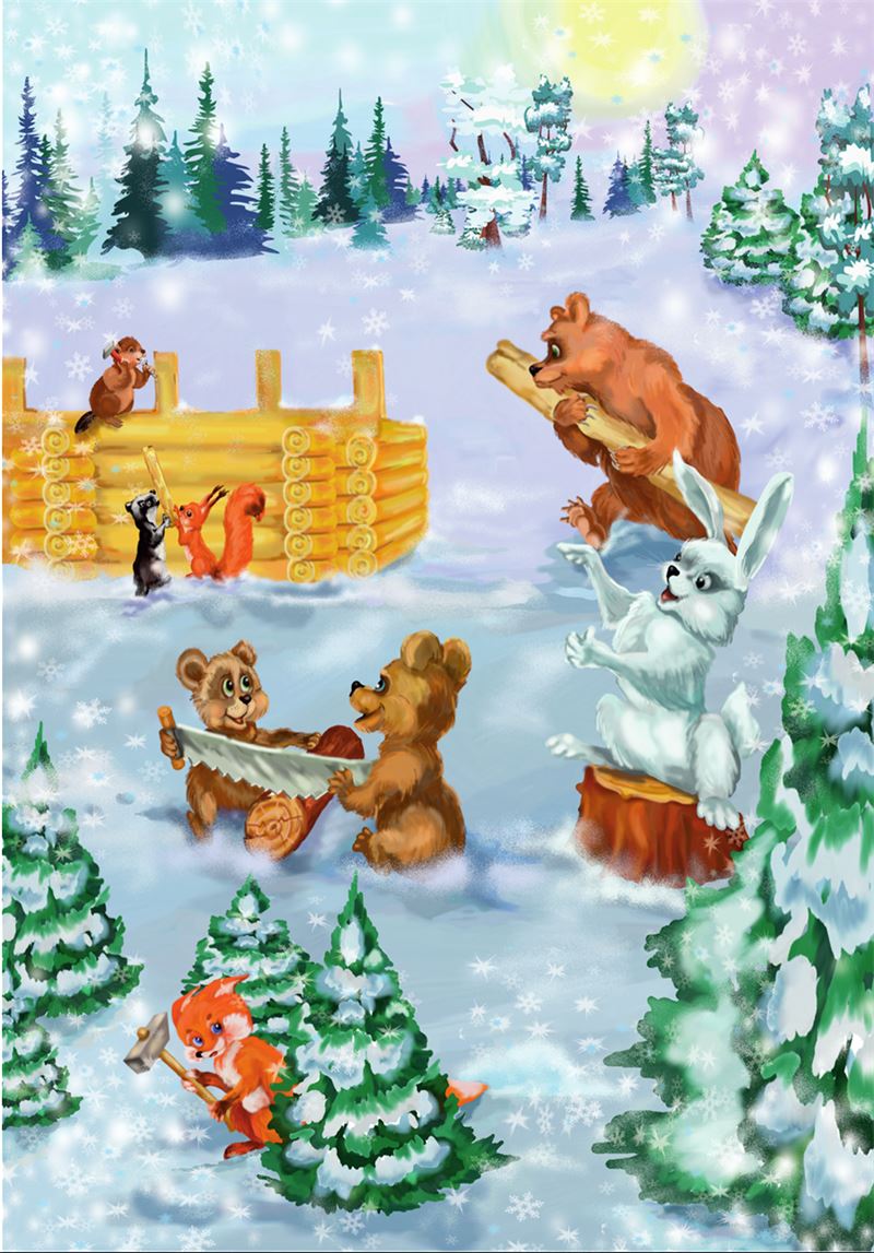Уже почти неделю полным ходом шло строительство избушки для Деда Мороза. Работа шла весело, слаженно. Каждый строитель знал своё дело. Мудрый Филин, Медведь-Богатырь и Заяц-Успеваец ловко и мудро всё организовали.