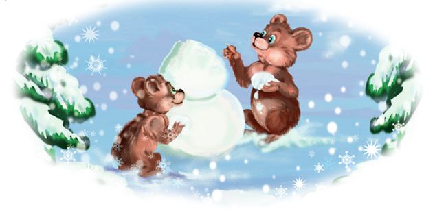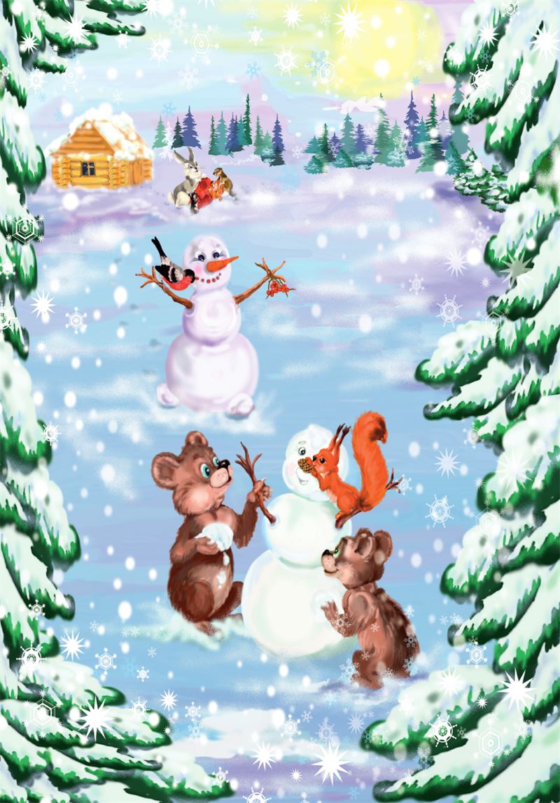 А когда снега нападало побольше, медвежата Любчик и Славик слепили снеговика. Зайчонок Поскакун тут же принёс из своей норки морковку. Из неё сделали Снеговику нос. Ещё нашли два красивых камешка и сделали из них Снеговику глазки. Ротик нарисовали соком рябины, которую принёс в клювике снегирь.