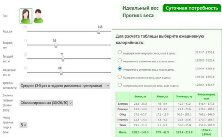 Дефицит калорий – это состояние, при котором количество потребляемых в пищу калорий ниже, чем уровень затрачиваемых калорий в день (физическая нагрузка, жизнедеятельность организма и т.д.). Чтобы точно рассчитать необходимое количество калорий, белков, жиров, углеводов (КБЖУ) для медленного, умеренного, быстрого или экстремального (не советую!) снижения веса можно воспользоваться «анализатором тела» на сайте «калоризатор» и т.п. Он даст точный расчет согласно возрасту, росту, уровню физической активности, текущему и желаемому весу. Пример на иллюстрации 1. Рассчитывая индивидуальный дефицит калорий, следует соблюдать баланс БЖУ, который включает в себя 30 % белков, 20 % жиров, 50 % углеводов (сбалансированная система питания).