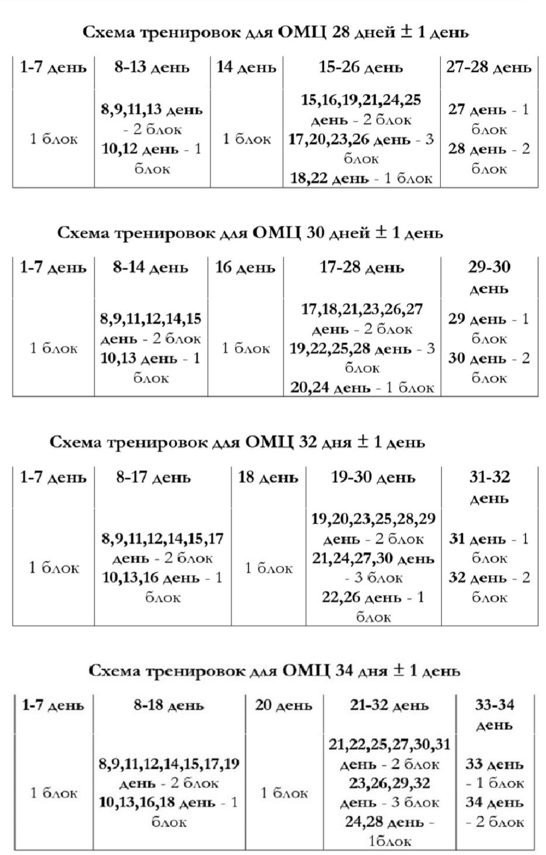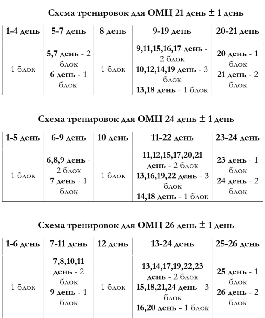 Ниже представлены схемы построения тренировок (1-3 блок) согласно среднестатистическим ОМЦ 21 – 34 дня (расхождение 1 – 2 дня приемлемо). Не забывай пользоваться календарем менструальных циклов, он поможет сориентироваться по дням и фазам ОМЦ, и ты сможешь выбрать необходимую тренировочную схему правильно.