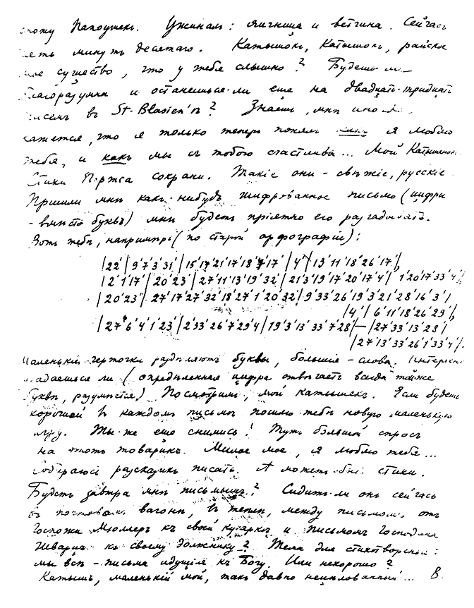 Утром великолепно купался с Ш.<урой> в Груневальде. Солнце огромное, жаркое. Прищуришься на него – и дрожит серебряный блеск, осколочек радуги. По дороге обратно купил конвертов, чернил (и, как всегда бывает в день покупки чернил, поставил кляксу)[105], отослал письмо. Обедал (да, должен тебе открыть маленькую тайну: до сих пор I had my meals либо на письменном столе, либо – если работал – на ночном столике. И то и другое было чрезвычайно неудобно. Сегодня уехал кто-то из жильцов, и наконец я получил удобный стол для meals. Он стоит у печки) – какое-то мясо и земляника, – потом пошел на теннис. Я так много играл и так было жарко, что промок, как мысч, – и, вернувшись, I took a perfectly delicious cold bath. Затем полежал (звонил Каплан: проститься), продумывая новый рассказик. Это будет обширная рецензия о (опять капнул…) несуществующем «литературном альманахе». Мне кажется, что выйдет довольно забавно (заметила, как я ловко огибаю лужицу?)[106], но совершенно неизвестно, поместит ли «Руль». Ужинал – на новом столе, – ел яичницу и мясики. (Тут вот просвечивает словесная задачка; интересно, разгадаешь ли) Сейчас половина десятого. Му love, нынче – тридцатый письмыш! Больше шестидесяти страниц! Почти роман! Если бы мы издали книжечку – сборник твоих и моих писем, – то в ней было бы не больше 20 % твоего труда, my love… Советую тебе наверстать, – еще есть время… Я сегодня невыразимо тебя люблю. Му love, в газетах пишут, что 29-го было землетрясенье по всей южной Германии, – что во Фрейбурге «шатались дома». Ты что-нибудь чувствовала? Когда я был маленький, я всегда мечтал о громадном наводнении: чтобы на лодочке прокатиться по Морской, свернуть… Торчат из воды фонари, дальше – торчит рука: подплываю, – оказывается, это бронзовая длань Петра! Му love, do you miss me frightfully? Когда ты приедешь, я тебя встречу на станции один – или совсем не встречу. В «альманахе» будут стихи некоей Людмилы N., подражающей Ахматовой. Приведу пример: