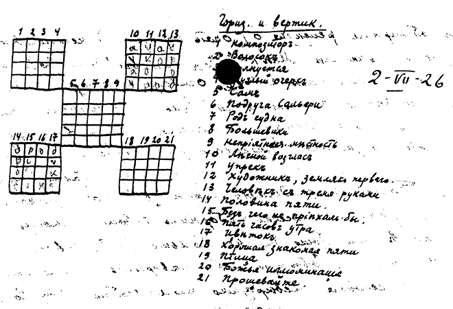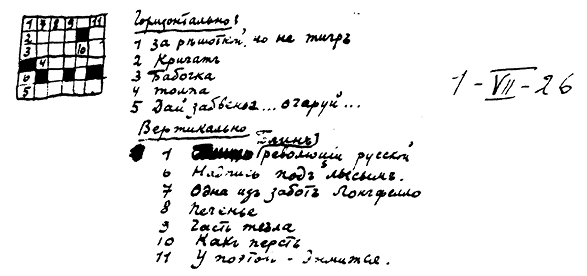 Моя Кошенька, я еще не знаю, как ты приняла телеграмыш. Обещанную маленькую игру – крестословицу (как приятно писать слово, которое сам создал! Ему уже годика два) найдешь выше. Моя Кошенька, пришли мне еще снимочек! Кустику одному – скучно… И описанье виденных бабочек. Стихи мои «Комната» Фальковская взяла, чтобы переписать на машинке. Они пойдут, вероятно, в субботу, – я уже предупредил Гессена. Любовь моя, не скучай очень, прибавляй фунтики, по фунтику в день, чтобы к приезду было полпуда. Кошенька моя…
