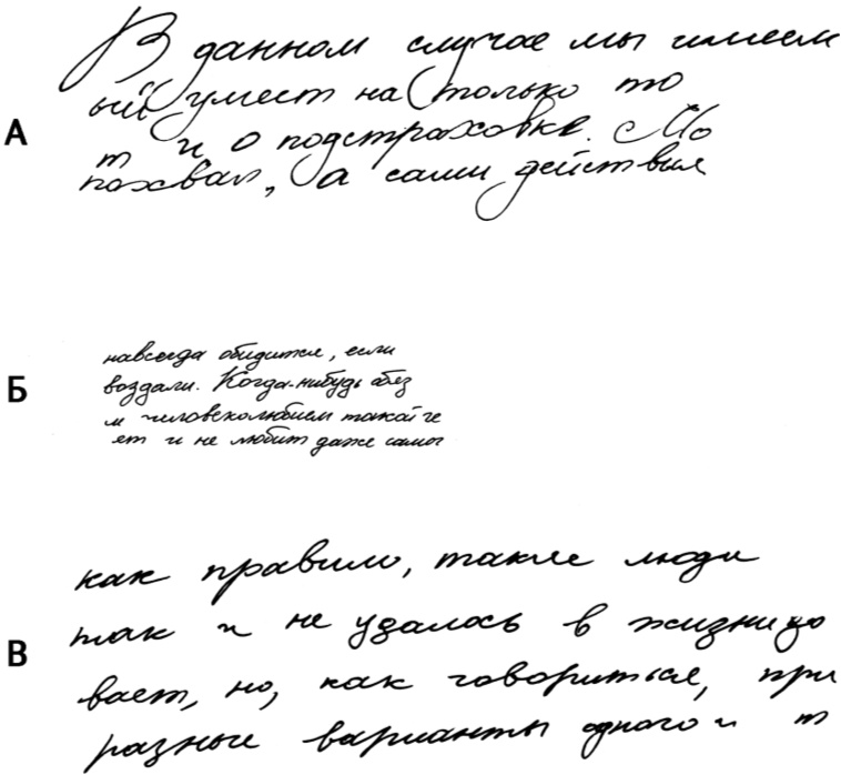 Проверьте себя, оценив образцы почерка на рисунке 12. Какой из них является соразмерным? Какой разряженным? Какой сгущенным? Сопоставьте объем чистого и заполненного пространства страницы, чтобы определить наличие баланса между ними.