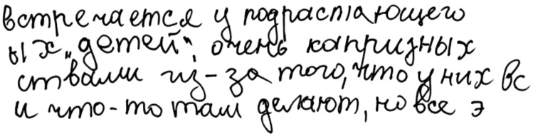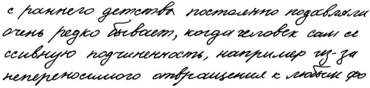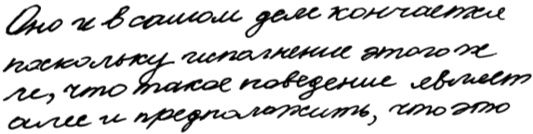 Слишком тесно стоящие слова, соприкасающиеся или почти соприкасающиеся друг с другом (рис. 23), говорят о том, что пишущий испытывает острую потребность в обществе других людей. Он не оставляет места для саморефлексии, и поскольку он не нуждается в собственном пространстве, то не признает и право других людей на таковое. Его рамки социального поведения – то есть того, что он считает социально приемлемым, «приличным» – оказываются весьма расплывчатыми.