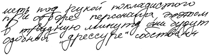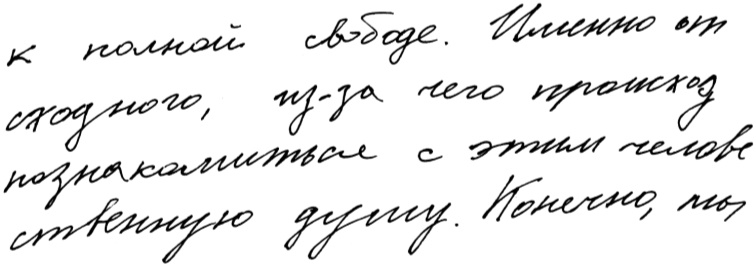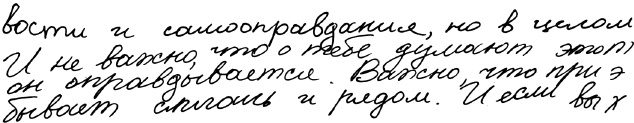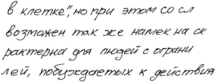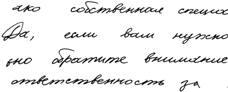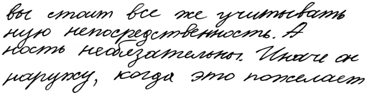 Как и в случае с широким межстрочным интервалом, здесь выявляется способность пишущего к спонтанному действию. Он может быть обворожительным и утонченным, но также и сдержанным и отстраненным. Его не так легко раскусить, поскольку он не склонен откровенничать о себе. Скорее всего, его окружение состоит из немногих избранных лиц.