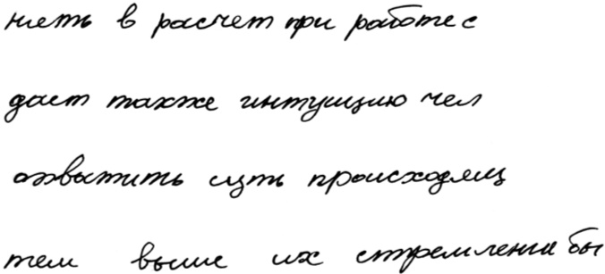 Четкий рисунок строки демонстрирует способность к усвоению нового опыта день за днем и к соответствующему его применению. Пишущий способен объективно смотреть на вещи, просчитывать различные варианты событий и их возможный исход. Он крепок умом и прибегает к здравому смыслу при принятии любых решений.