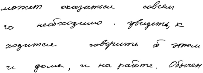 Умеренно широкие пробелы между словами (немногим более длины буквы «М» для данного почерка) (рис. 20) характерны для людей рассудительных, для тех, кто имеет обыкновение сделать паузу перед тем, как принять окончательное решение. Подобная их неспешность свидетельствует об ответственном отношении к другим людям, поскольку они затрачивают дополнительное время на то, чтобы убедиться в правильном их восприятии слушающими.