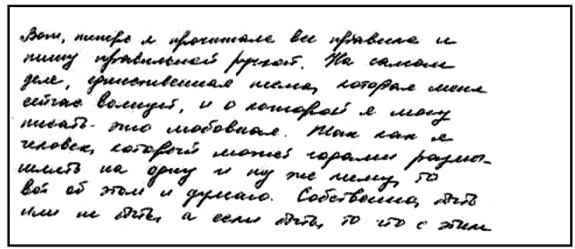 Обладатель мелкого или узкого почерка без полей отличается истовой бережливостью, чуть ли не скупостью. Возможно, у гоголевского Плюшкина был именно такой почерк.