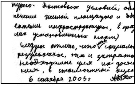 Смелость, с которой пишущий устремляется вперед, говорит о его решимости в освоении новых областей и в постановке новых целей. Он куда больше интересуется будущими событиями, чем анализирует прошлые. Он не из тех, кого сильно беспокоят условности, кто следует традиционному укладу вещей. Чрезмерно широкое левое поле говорит о стремлении избавиться от каких-то неприятных воспоминаний о прошлом.