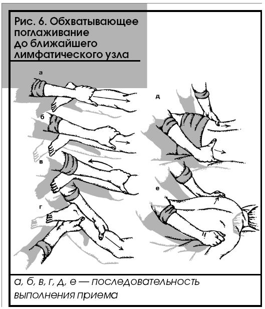 Обхватывающее поглаживание – вспомогательный прием, при котором кисть и пальцы массажиста принимают форму желоба: большой палец максимально отведен и противопоставлен остальным сомкнутым пальцам (рис. 6). Кисть обхватывает массируемую поверхность, может продвигаться как непрерывно, так и прерывисто, в зависимости от задач, поставленных перед массажистом. Движения производят к ближайшим лимфатическим узлам.
