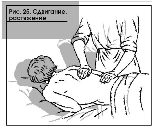 Сдвигание – вспомогательный прием, при котором, зафиксировав массируемую поверхность, производят короткие, ритмичные движения, сдвигая ткани друг к другу (рис. 25). Противоположные движения называются растяжением.
