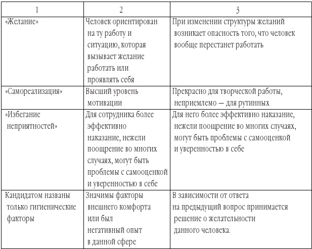 Получив ответы на данные вопросы, можно соотнести ожидания кандидата с реальной ситуацией в компании; проанализировать мотивационный потенциал будущего сотрудника, в чем может помочь прилагаемая таблица (см. таблицу 1.9).