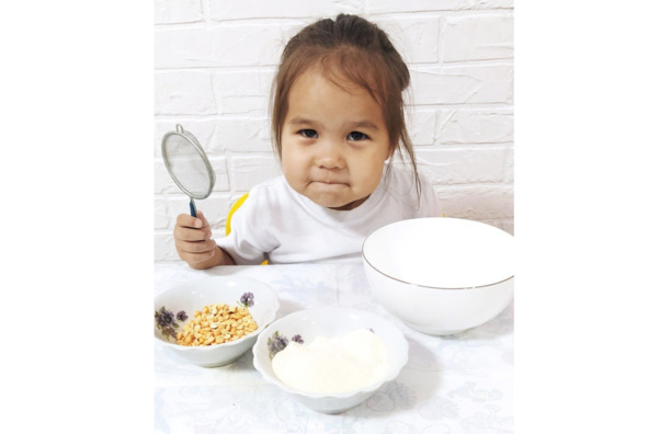 Ход игры: возьмите манку и смешайте с горошком или фасолью. Задача ребёнка – отделить одно от другого с помощью сита как на фото 8. А на фото 9 видно как Рушана отделила горошек от манки.