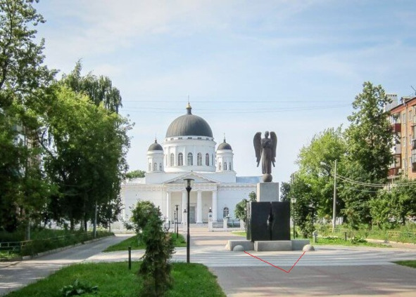 Нижний Новгород. Сквер Августина Бетанкура. Памятник «Скорбящий ангел» (2011 год). На фотографии видно, что вокруг памятника на орбите вращаются восемь электронов.