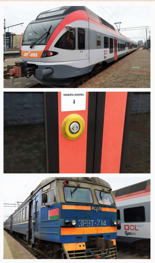 Новые и старые вагоны электричек. Кнопка для открытия электричек.