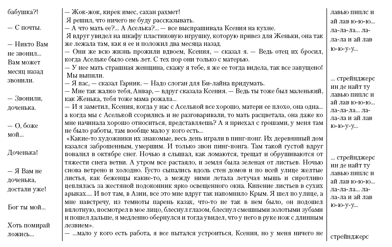 Это был голос Булата Мулюгенова, помощника акима Алматы, про которого они говорили всю осень, а я даже не обратил на это внимания. Я видел накрытый новогодний стол в их квартире, цветы и шампанское, видел, как весело и возбужденно суетится Аселька, красиво так ходит, как она ходила, когда знала, что я смотрю на нее, а Булат сидит в кресле, смотрит на нее и покачивает ногой в моем тапочке. Все горит, искрится и сияет в их квартирке на углу Гоголя и Мира. Он знает, что будет с ней сегодня, сглатывает слюну, все у него дрожит: женщина под Новый год особенно сладка… особенно, блядь, нужно с кем-то переспать, чтобы весь год потом с кем-то спать, чтобы…