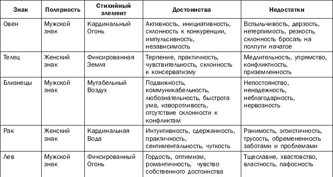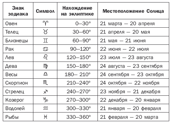 Существуют 12 знаков зодиака (табл. 2), расположенных вдоль эклиптики. Это Овен, Телец, Близнецы, Рак, Лев, Дева, Весы, Скорпион, Стрелец, Козерог, Водолей, Рыбы.