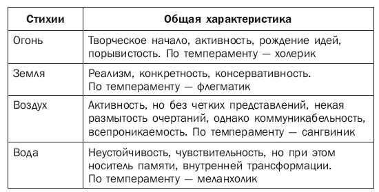 В древности сложилась точка зрения, согласно которой основу Вселенной составляет учение о четырех стихийных элементах. Поэтому все можно рассматривать в качестве проявления одного из элементов – Огня, Земли, Воздуха и Воды (табл. 4).