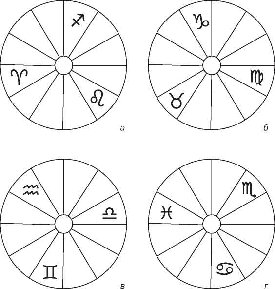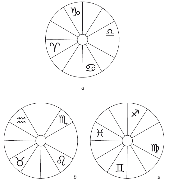 Рис. 8. Кресты зодиака: а – кардинальный; б – фиксированный; в – мутабельный