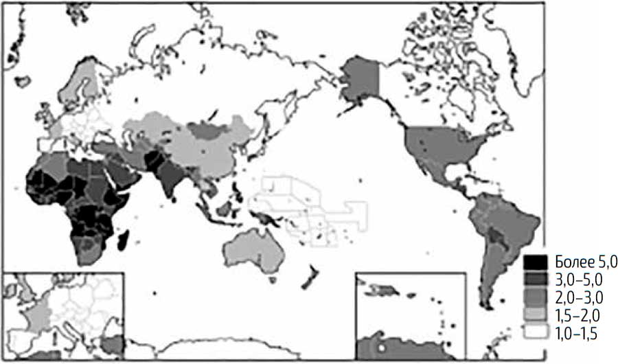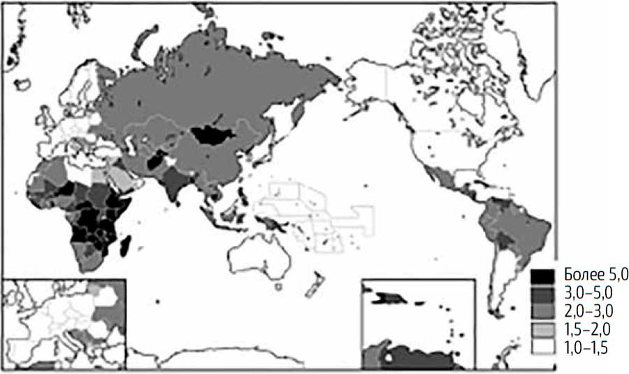 Карта голода демонстрирует и еще один интересный факт. Оказывается, для голодающих стран характерен более высокий уровень рождаемости (Рис. 2).