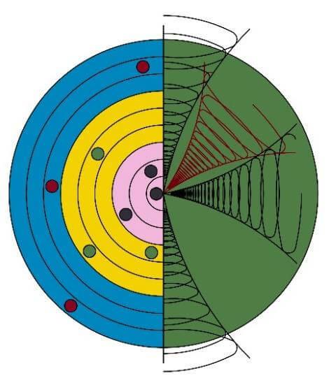 Теперь представим, что каждый оборот вихря, любого из частиц ядра, по орбите движения происходит без столкновений в пределах одной сферы, но по разным оболочкам, как одна в другой. Тогда все частицы при взаимодействиях имеют возможность совершенно автономно изменять любые свои параметры вибраций, как функции волны в пределах пространства своих оболочек. Например, менять направления вращения и движения, даже путём переворота, то есть на встречное или однонаправленное, перпендикулярное орбитам соседних зарядов или диполей в соседних оболочках, или параллельное, и т. д. (см. Рис. 12). При этом, между соседними энергетическими оболочками, как и частицами их образующими, и в итоге между сферами, будут возникать не только активность электромагнитных полей и различные явления отталкивания или притяжения, замедления или ускорения, обмена количеством зарядов и моментов. Вызванные свойствами электричества и магнетизма, в том числе полями напряженностей и индукции, но и свойствами вихрей с их градиентами плотностей среды окружения. И эти воздействия будут сжимать, уплотнять среду материи к центру ядра и создавать условия для изменения свойств атома, взаимодействия с внешней менее плотной средой не только электроносферы, но и с пространством вне атома. Образуя подвижные градиенты плотностей зарядов и на поверхности её сферы, обеспечивая таким образом построение ковалентных, ионных, полярных и иных связей. По аналогии вспомним о том, что в центре Земли давление составляет не менее 4 млн. атмосфер, и это макромир. В итоге, взаимные изменения орбит электронов, нейтронов, протонов во всех мыслимых плоскостях, в пределах своих энергетических оболочек, оказывают влияние на местоположение частиц друг относительно друга, на переход их зарядов с оболочки на оболочку и из сферы в сферу. В результате изменяются не только свойства веществ, но и образуются кристаллические решетки новых соединений, усложняются структуры новых форм материи. Может в этом и состоит разгадка «парадокса чаинок» на дне стакана?