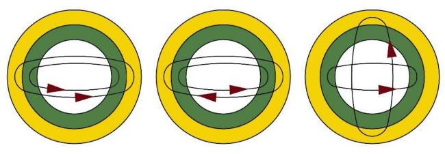 Рис. 12. Орбитали и направления движений по ним частиц в соседних оболочках сфер структуры атома