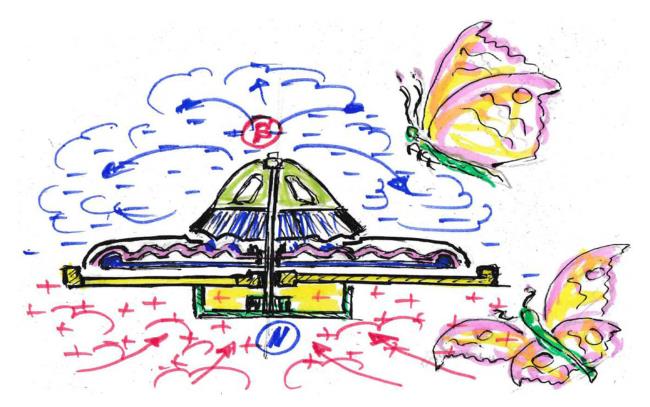 В данном случае, благодаря центробежным воздействиям зарядов в атмосфере, над платформой зарождаются отрицательно ионизированные потоки энергии (патогенной для живых клеток) увеличения и расширения. Тут частицы среды переходят в неустойчивое состояние с повышенной частотой структурных вихрей, которые при малейшем увеличении зарядов извне, способны к моментальному объёмному расширению. В данном случае внешний корпус служит устройством для уравновешивания деформаций среды от воздействия на неё через реакцию противодействия материала корпуса, а не от «гравитации» извне. Тогда под платформой возникают явления уменьшения и конденсации охлаждённой атмосферы в результате влияний сформировавшихся центростремительных потоков зарядов вихрей, циркулирующих перпендикулярно силовым линиям уже единого диполя устройства. Радиальные знакопеременные движения зарядов различной природы в совокупности с вращением неизбежно образуют вокруг установки электромагнитные поля вихрей в форме тора.