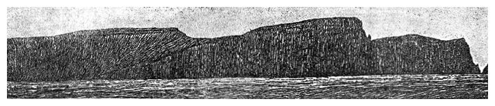 Выветрелые стены, все в трещинах, ребрах и уступах, изувеченные прибоем, совершенно отвесно поднимаются из бурных волн на высоту нескольких сот метров до уровня прежней поверхности острова, разъеденного морем. Впереди вытянулся длинный узкий остров Чаек с такими же высокими отвесными стенами и тоже с остатками плоской равнины наверху – руинами древней страны, которую море и время еще не совсем уничтожили.