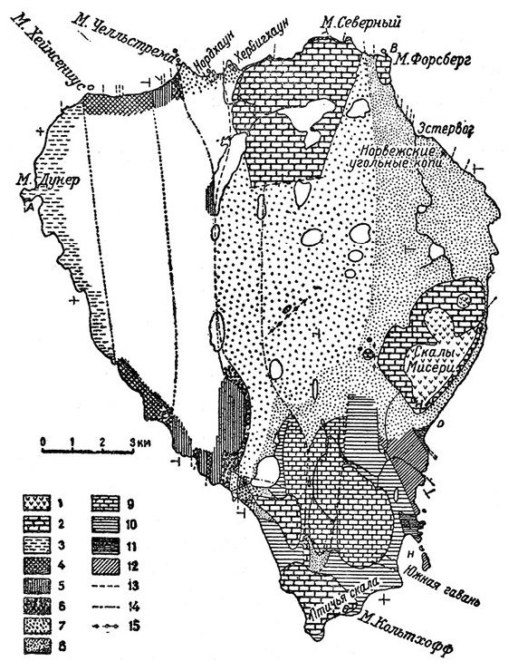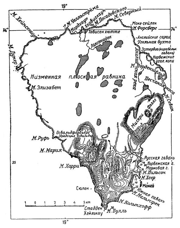 В новейшие времена серьезные исследования геологического строения острова были предприняты шведскими учеными, полярниками. Из них следует особенно отметить профессора А. Г. Натхорста[46], побывавшего здесь в 1898 году, и доктора Андерсона, сопровождавшего Натхорста в упомянутом году, а затем в 1899 году проведшего на острове два месяца – с 23 июня по 18 августа.