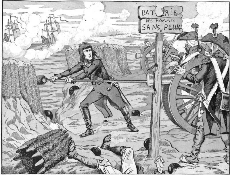 Генерал Бонапарт во время осады Тулона заряжает пушку, как простой солдат. На табличке надпись: «Батарея бесстрашных». Художник Жоб (Ж. Онфруа де Бревиль)
