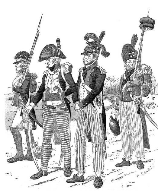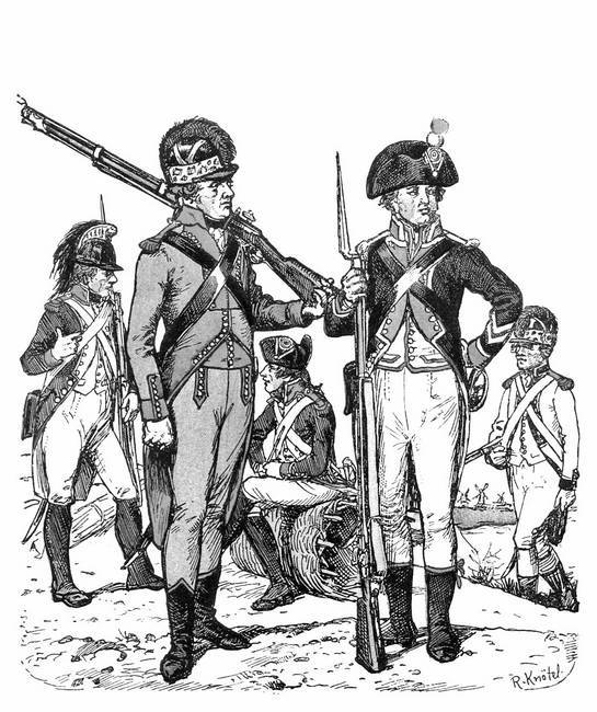 Французская армия в 1793 г.: солдаты Национальной гвардии, Северного и Батавского легионов, 1-го полка линейной пехоты. Художник Р. Кнётель