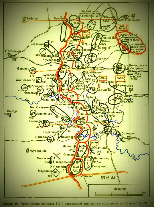 316 сд Волоколамский участок Можайской ЛО (линии обороны) обороняли: 302 пульбат (пулеметный батальон), пехотное училище им. Верховного Совета, 488 и 584 ап пто (пушечные артполки противотанковой обороны) , батальон 108 сп, 41озад (отдельный зенитный артиллерийский дивизион), дивизион Московского арт. училища, 41 и 42 огнеметные роты, танковая рота. Не обладая боевым опытом, дивизия была усилена двумя артиллерийскими полками и танковой ротой, и таким образом, располагала мощной артиллерией: с приданными дивизии средствами в наличии было 207 орудий, из них: 25-мм – 4; 45-мм – 32; 76-мм полковых пушек – 14; 76-мм дивизионных пушек – 79; 85-мм – 16; 122-мм гаубиц – 8; 122-мм пушек – 24 и 152-мм пушек – 30.