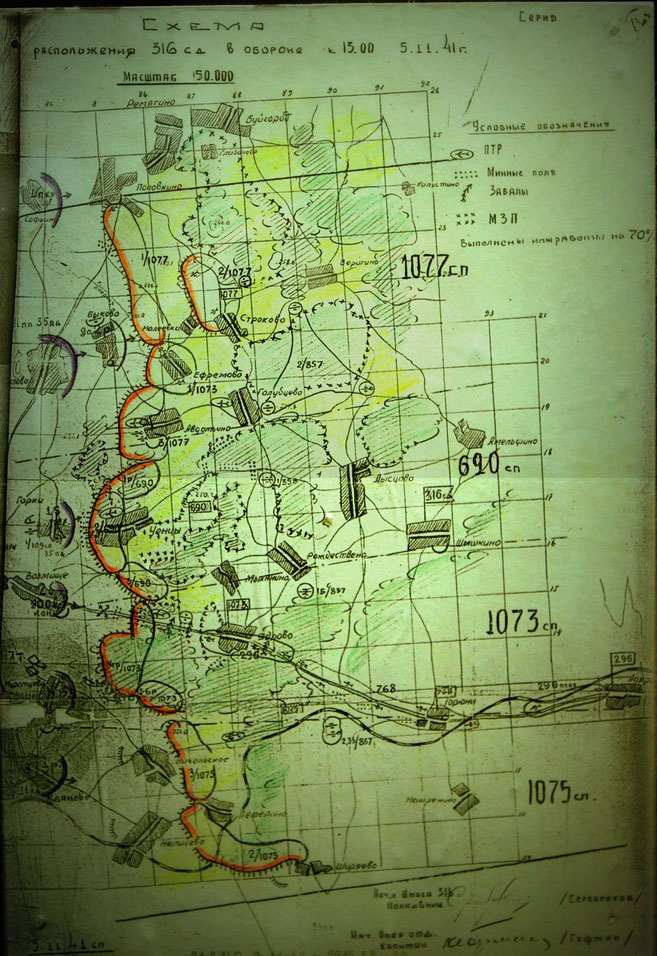 15 октября, когда дивизия окопалась и заняла оборону в 10 -12 км. западнее Волоколамска, на нее обрушился удар трех танковых дивизий (2-я, 5-я и 11-я) и 35-й пехотной дивизии Вермахта. Чтобы понять насколько существенным был перевес сил, достаточно обратиться к архивным данным. Согласно боевому уставу РККА того времени, численность наступающего противника должна была втрое превосходить силы обороняющихся, но на деле всё оказалось иначе: 316-я дивизия заняла оборону на участке в 40 км, при действующем нормативе 8 – 12 км., таким образом превосходство наступающих сил немцев было критическим. И полоса этой обороны была одноэшелонной, то есть за одной полосой окопов и укреплений, на которой расположились бойцы трех полков (1073-й,1075-й и 1077-й) больше ничего и никого не было. Грубо говоря, на одного красноармейца приходилось двенадцать гитлеровцев. При том, что из-за больших потерь тактическая плотность обороняющихся в то время была очень низкой: 0,2 – 0,5 стрелкового батальона, 2-3 орудия и половина танка на 1 километр фронта. То есть около сотни бойцов на 1 км. обороны. И это против танковых соединений!! Прорви фашисты наши рубежи, и на 20-30 км. в направлении Москвы путь для них был бы свободен.