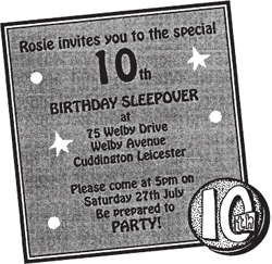 So we finally knew that our tenth birthday sleepover was going to be held at Rosie’s house, and that was pretty cool. Not only does she have a humungous house with about a million rooms, but her mum is really great, really young and trendy and a real laugh. The best bit though, is that we can actually write on Rosie’s bedroom walls!