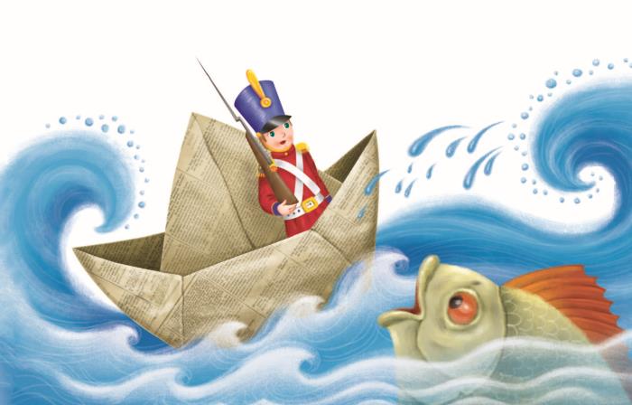 Утром солдатика переставили на окно. Вдруг оно распахнулось, и солдатик выпал! Мальчик и служанка выбежали на поиски, но не нашли его. Начался ливень, а когда он стих, двое мальчишек нашли солдатика и отправили его в плавание по ручью на бумажном кораблике. Его бросало и вертело, потом занесло под широкий мост, где было совсем темно. Сразу за мостом ручей устремлялся водопадом в бурный канал. Кораблик стал тонуть. Солдатик приготовился погибнуть с честью. Но тут его проглотила рыба. Как же темно и тесно было у неё в желудке! Солдатик стоял прямо и крепко прижимал к себе ружьё. Рыба вдруг замерла: её поймали. Вдруг блеснул свет… Это кухарка распорола рыбе брюхо и вытащила солдатика.