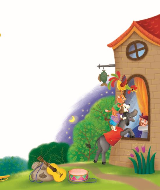 И вот стало смеркаться. В поисках ночлега свернули наши музыканты в лес и увидели там среди деревьев огоньки. Направившись в ту сторону, друзья пришли к избушке, где жили лесные разбойники. Тут осёл подошёл к окошку, пёс влез ему на спину, кот запрыгнул на пса, а петух взлетел на спину коту. Да как запоют они во всё горло – не зря же всю дорогу хором петь учились. Разбойники едва не померли со страху. И, побросав всё своё добро, разбежались в разные стороны, да так, что больше никто в тех краях их не видел. А наши друзья остались жить в той избушке и про город Бремен больше не вспоминали. А зачем он им теперь, когда и так всё замечательно?