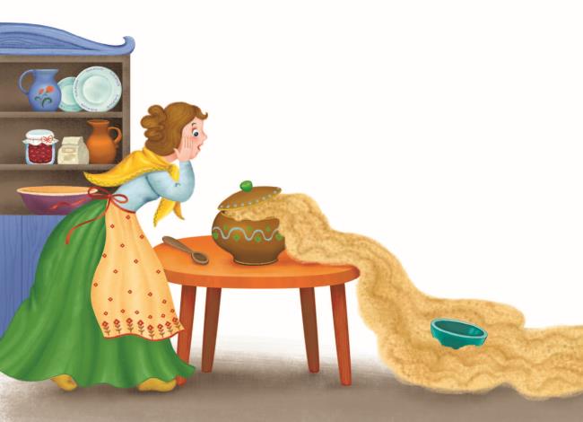 А горшочек всё варит и варит. Позабыла женщина, что нужно сказать, чтобы его остановить. Испугалась она, бросилась дочь искать, а выйти со двора не может – всё горячей кашей залито. Тогда стала она дочь с крыльца звать.