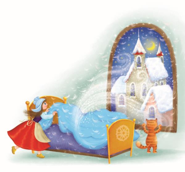 – Здравствуй, милая! Не хочешь послужить мне? Нужно, чтобы ты мне постель застилала и перину с подушками сильно взбивала. Когда перья летят во все стороны, тогда на земле снег идёт. Знаешь, кто я? Я госпожа Метелица.