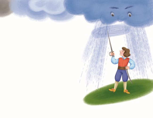 Тут хлынул дождь. А младший сын вынул из ножен шпагу и ну ею над головой вращать. Да так быстро, что ни единой капли дождя на него не упало. Ливень как из ведра льёт, отец со старшими сыновьями насквозь промокли, а младший совершенно сухой, словно и нет никакого дождя.