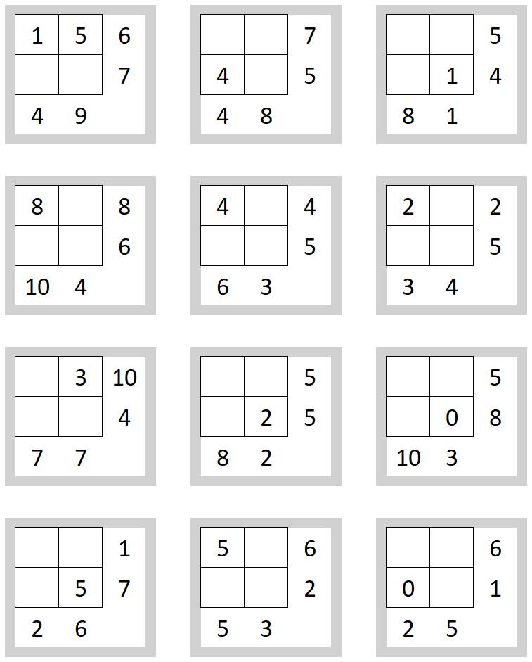 Правило: сумма чисел по вертикали и горизонтали равна числу за пределами квадрата.